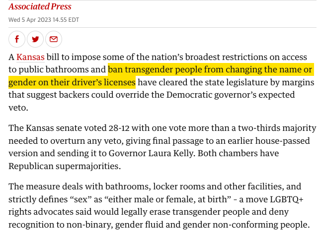 But at this point, with states just implementing policies that totally obliterate trans people's rights to more or less exist (Kansas is trying to make it illegal for trans people to update their names, even -- theguardian.com/us-news/2023/a…), why...