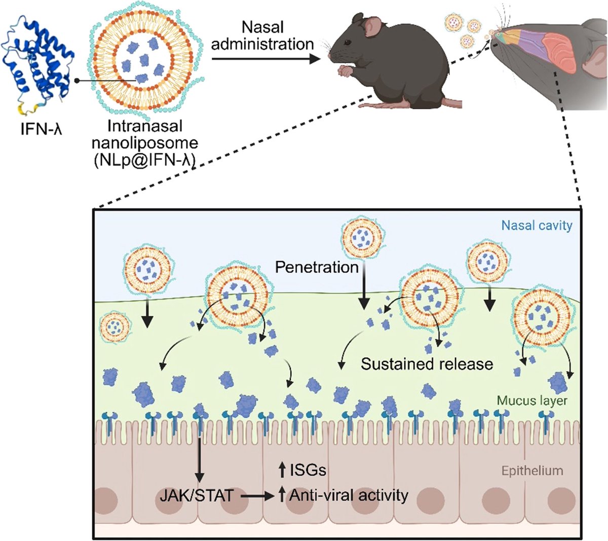 To keep it in the nose longer, the protein was packaged in nanoliposomes and coated with chitosan, greatly improving adhesion to nasal mucosa and penetration through thick mucus. 3/