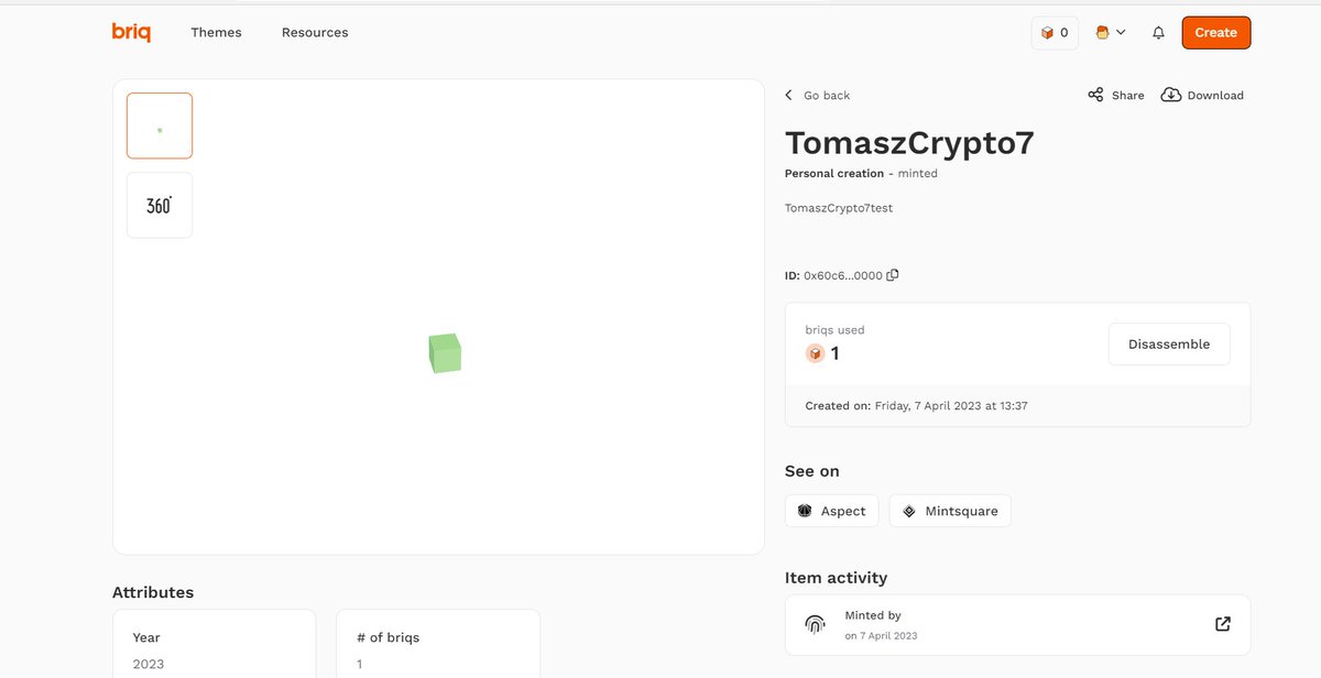 Briq jest protokołem, aplikacją za pomocą, której możemy stworzyć/zbudować własne NFT od podstaw. Możemy również gotowy plik/obraz zamienić w gotowy zestaw briq, link -