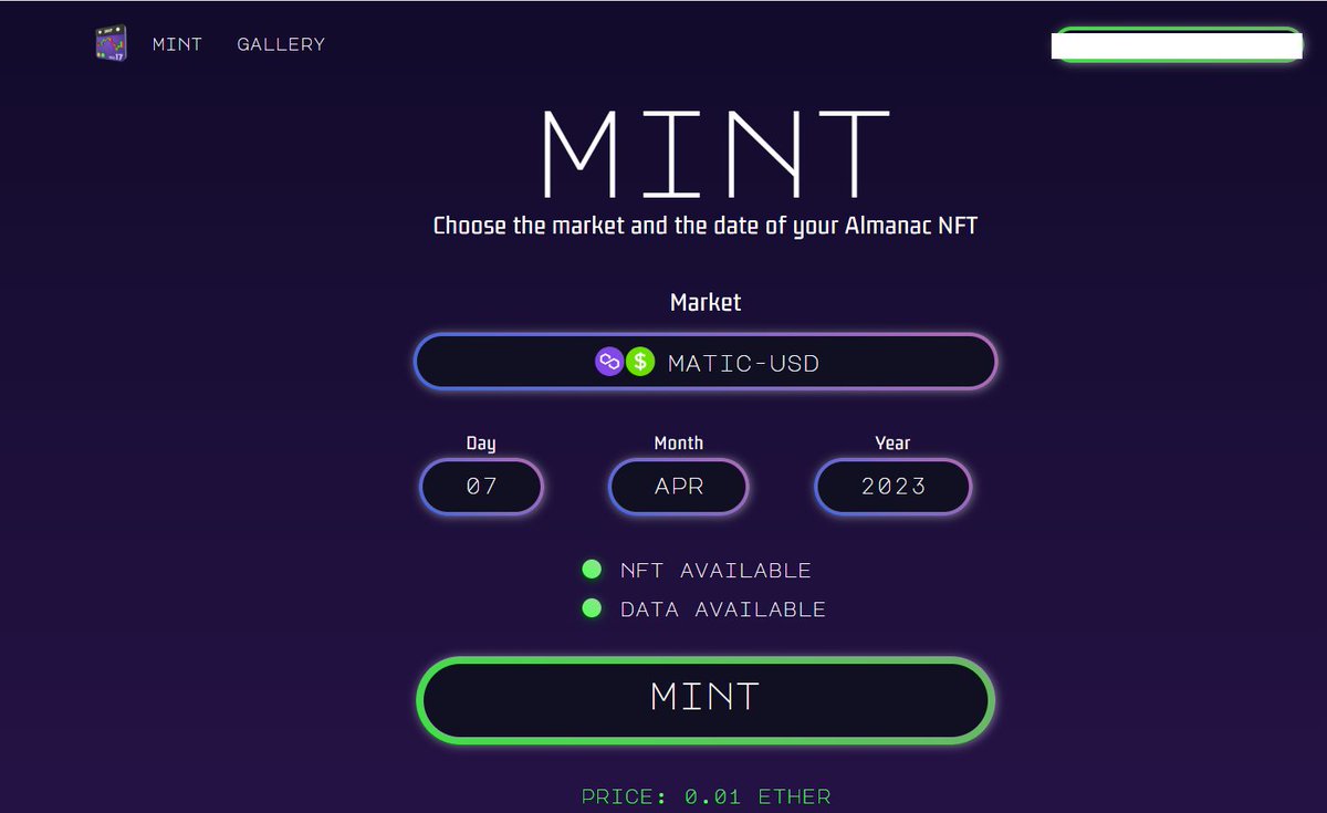 Dodatkowo możemy wybić Almanac tj. wykres. Wybieramy rynek np. matic-usd, następnie wybieramy datę i mintujemy. Cena to 0.01 eth.