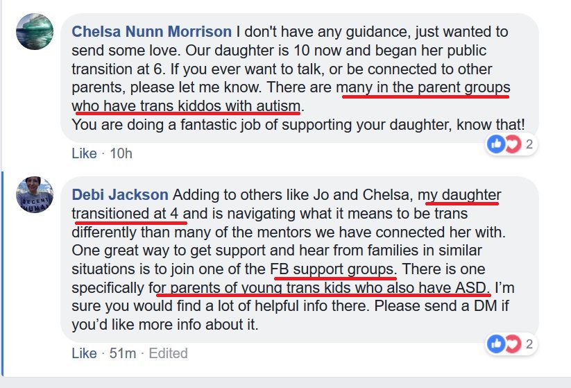 There's every-increasing evidence parents of children with autism are identifying them as "trans" early in life. Entire support groups formed to support this.