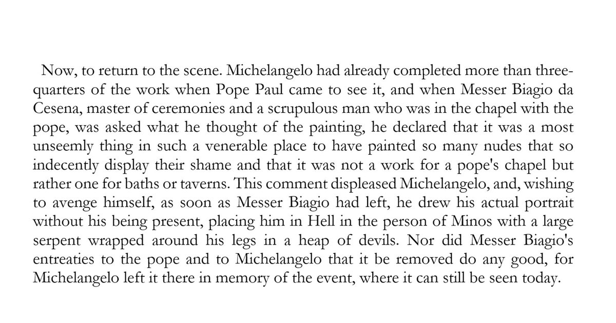 Its departure from scripture, its complex composition, its profusion of violently contorted bodies... as Vasari writes, this was simply too much for some, especially in a place like the Sistine Chapel:
