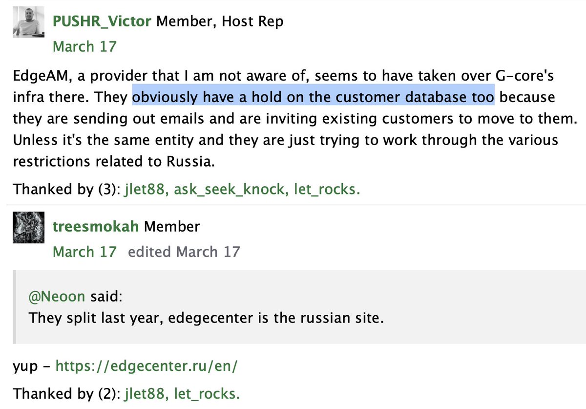 Like the Low End Talk message board, where this discussion speaks about a new provider, EdgeAM, suddenly taking over G Core's database and login panels. Same passwords and everything.