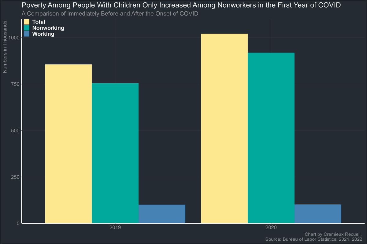 Between 2019 and 2020, the number (in thousands) of families with children who were under the poverty line and in the labor force moved from 101 to 102. But the out of labor force number changed from 755 to 919.