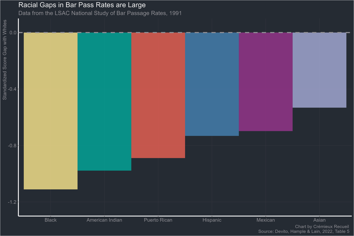 The size of these differences is pretty big, even in very different datasets. In the LSAC National Study of Bar Passage Rates, the gaps were comparable to the racial gaps noticed with typical IQ tests.