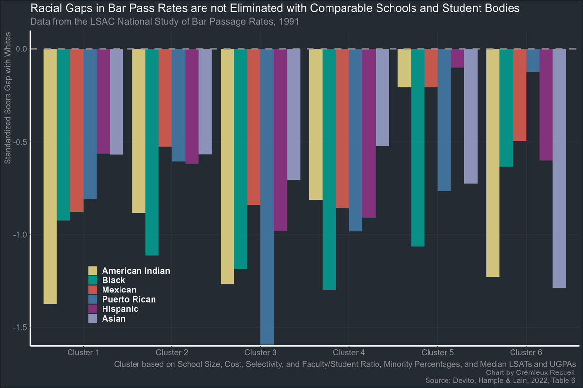 And the differences aren't attributable to the differences in schools people went to. When the schools are clustered by their size, cost, selectivity, faculty/student ratios, minority population, and both median LSAT and undergraduate GPAs, differences within clusters remain.