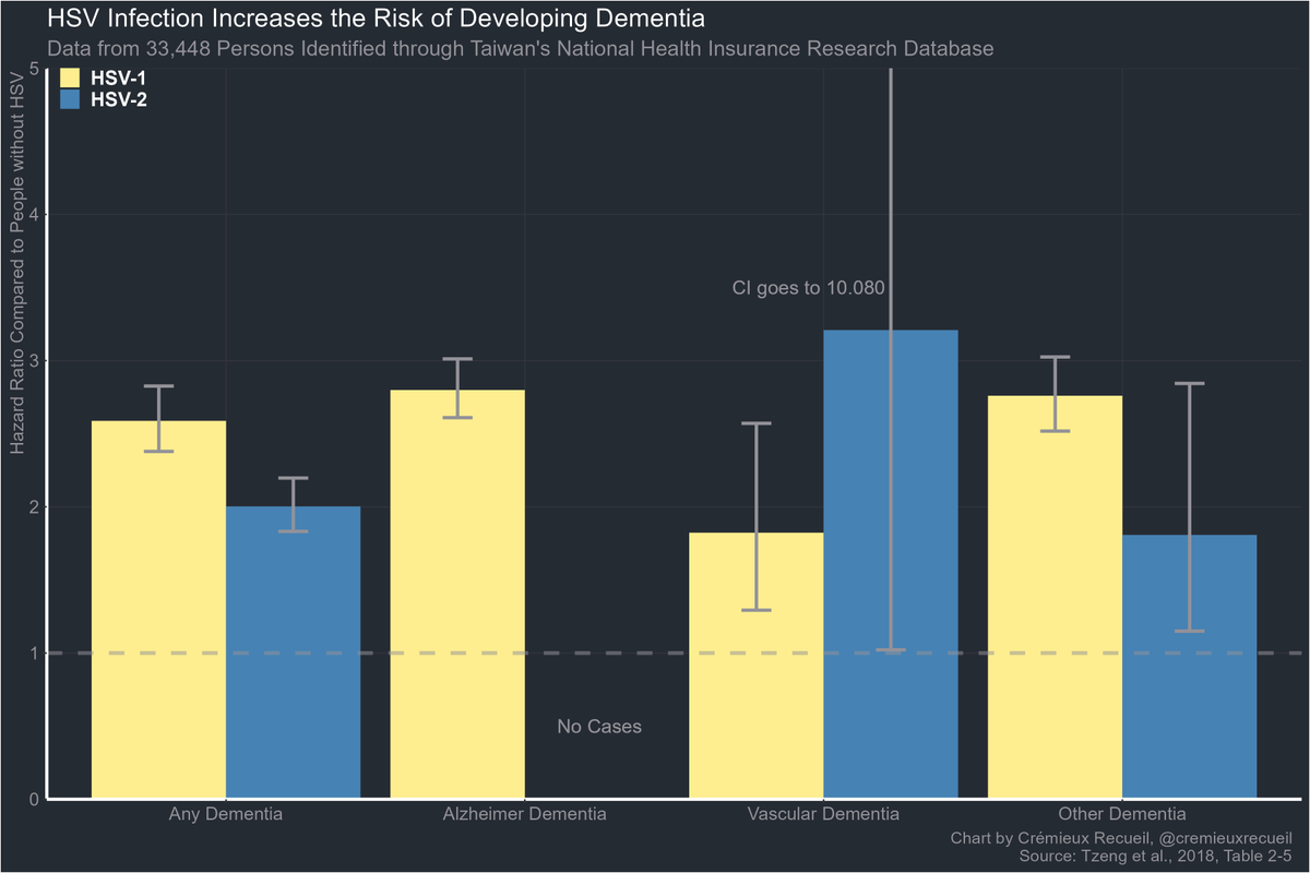 The various types of dementia in this large Taiwanese study were consistently related to HSV infection, with little strong evidence of difference by subtype.