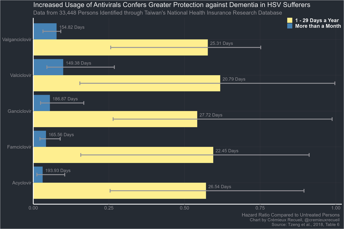 People who used antivirals sometimes enjoyed a moderately reduced likelihood of dementia. But people who used antivirals more heavily cut their dementia rates *a lot.*