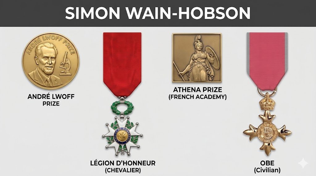 André Lwoff Prize, Athena Prize from the French Academy of Sciences, Officier de la Légion d'Honneur, OBE (Order of the British Empire, 2022 list) for services to virology.