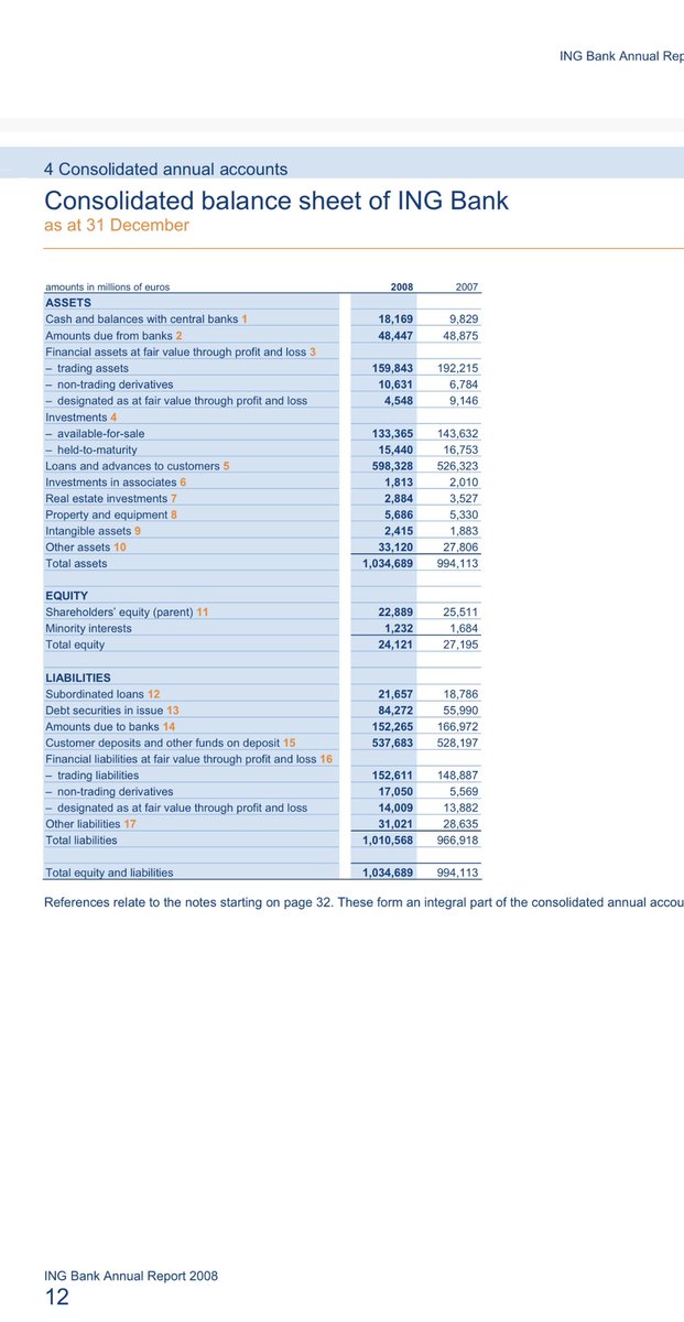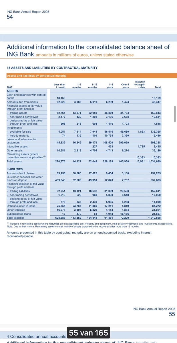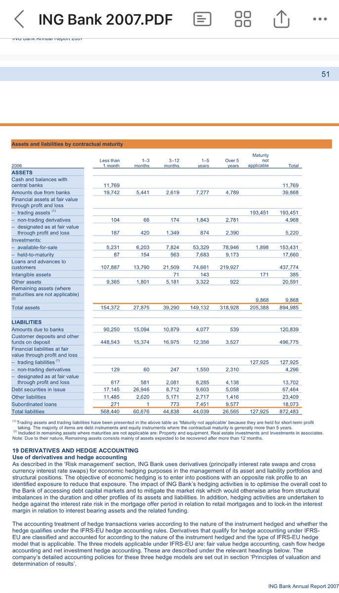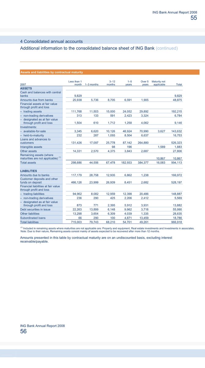 In 2007 waren trading assets (€192,21 miljard) v ING Bank €43 miljard > trading liabilities (€148,89 miljard) (2006 € 65 miljard) en niet langer ‘maturity not applicable’. € 111 miljard werd < 1 maand en in 2008 werd dit € 52,71 miljard (trading assets € 159,8).