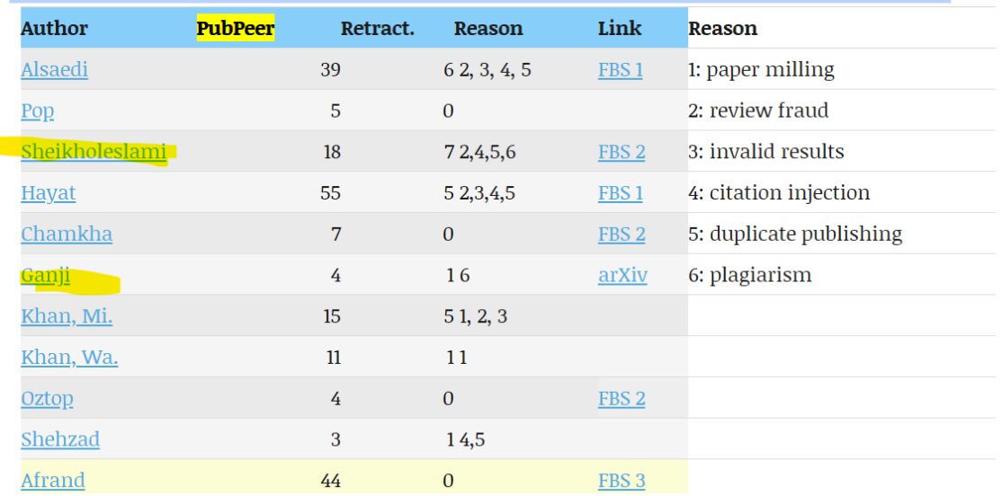 بیاین ببینیم این نویسنده ها، چند بار مقالاتشون از ژورنال ها به دلایل تقلب و … حذف شده (طبق سایت pubpeer):