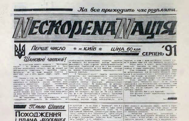 Передовиця газети "Necкорена Nація". Серпень 1991, Київ.