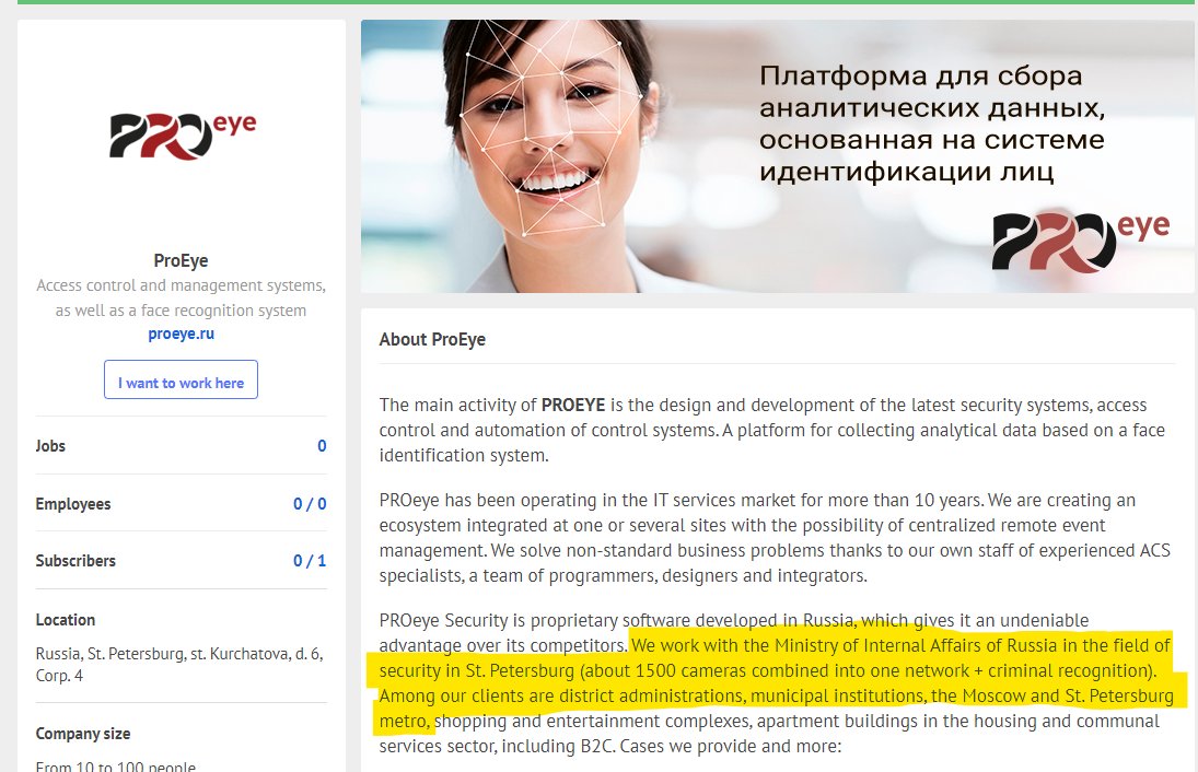 ProEye uhkeldab ise, et on Venemaa siseministeeriumi partner. Koostöös hallatakse 1600 videokaamerat Peterburis.