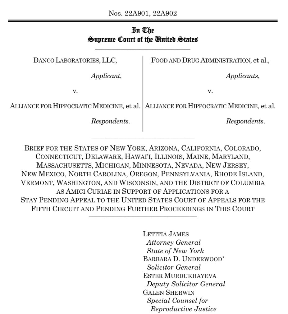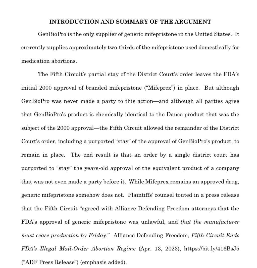 Generic mifepristone maker GenBioPro, in a @johnpelwood-led brief, urges a full stay by #SCOTUS because the Fifth Circuit ruling would purportedly halt their generic drug’s approval even though they weren’t a party: supremecourt.gov/DocketPDF/22/2…