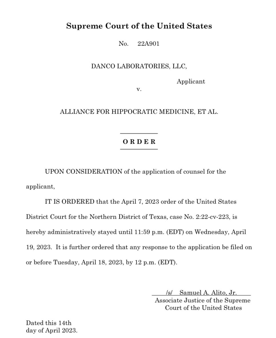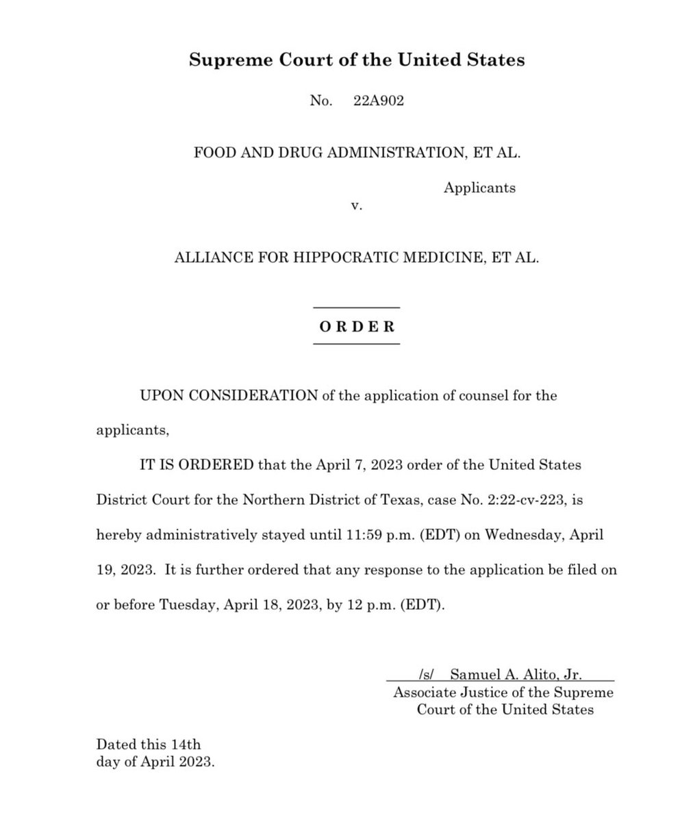 Supreme Court Justice Samuel Alito, as the circuit justice for the Fifth Circuit, issued the administrative stay. This means that Kacsmaryk’s order will remain on hold through 11:59p April 19.