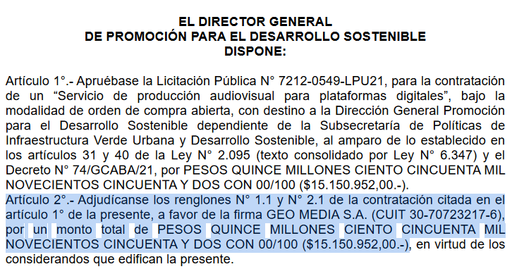En 2021 a Geo Media SA le dieron $15.158.000 para "promover el desarrollo sostenible" en la Dirección General de Promoción Para el Desarrollo Sostenible dependiente de la Subsecretaría de Políticas de Infraestructura Verde Urbana para el Desarrollo Sostenible.