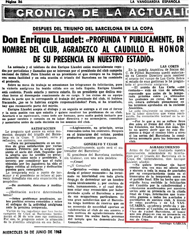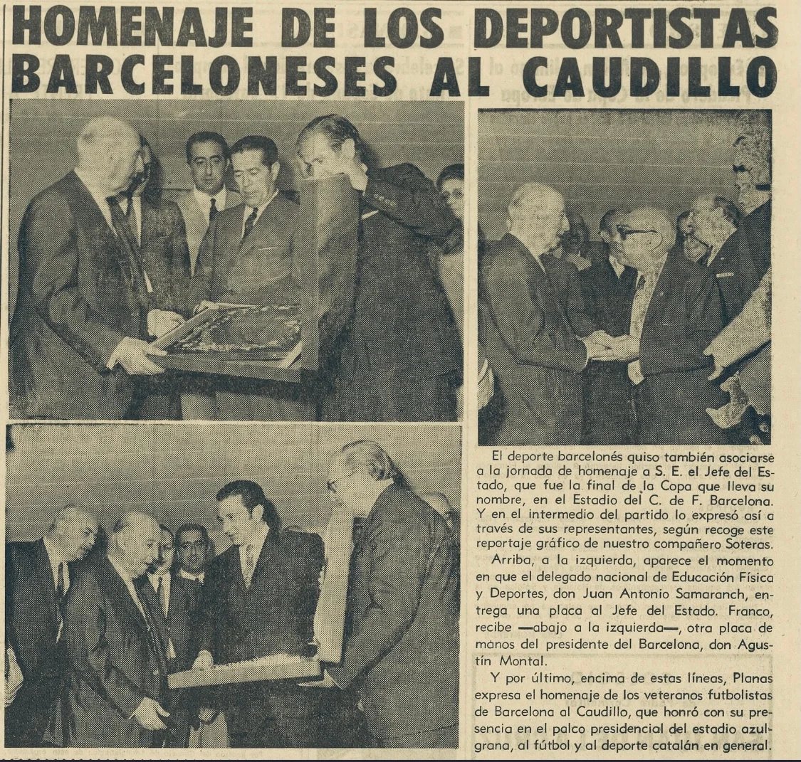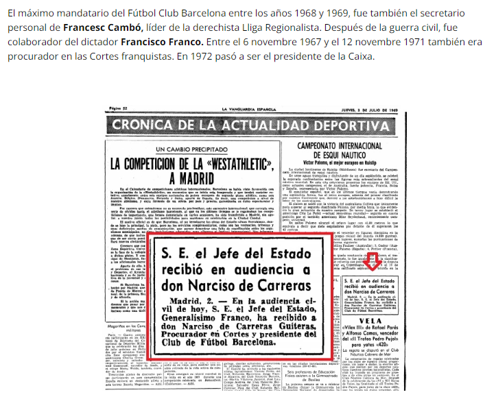 1968 - Narcís de Carreras es elegido presidente del Barça. Escribió en "La Vanguardia" un artículo dedicado a Franco en el "Día del Caudillo".