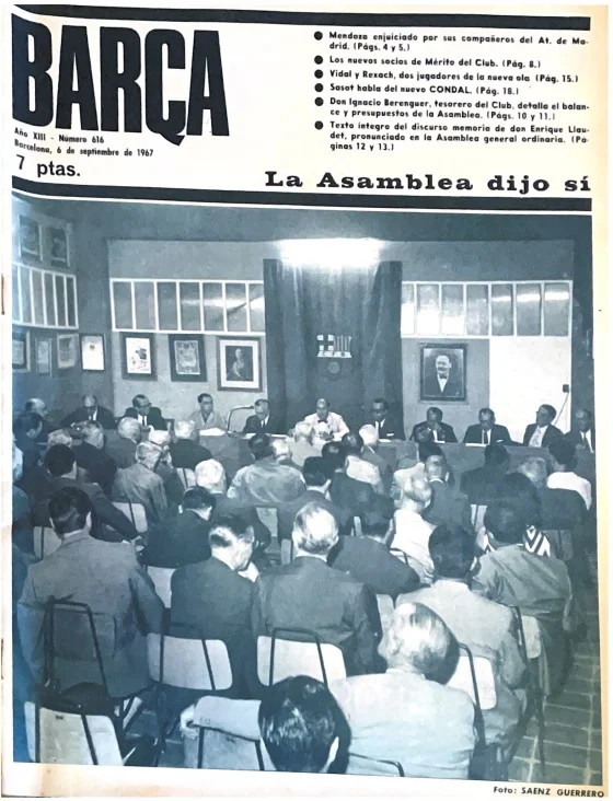 1967 - El presidente del club azulgrana, Enrique Llaudet, preside la Asamblea Ordinaria correspondiente a la temporada 1966/67, como se puede apreciar en la revista "Barça".