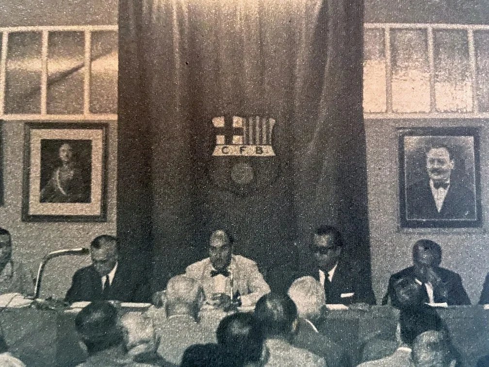 A la derecha del escudo del Barça, un retrato de Gamper, a la izquierda, el de Franco...