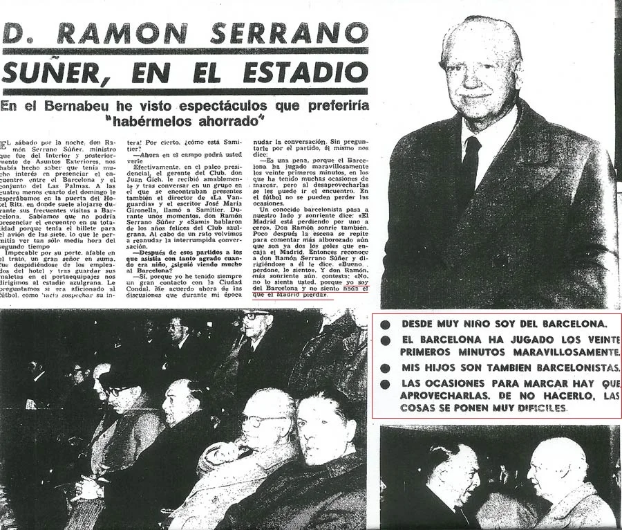 1969 - Ramón Serrano Suñer, cuñado de Franco, fue ministro entre 1938 y 1942 durante la dictadura. Durante una entrevista concedida desde el a palco presidencial del Camp Nou, afirmó: "Soy del Barça desde pequeño... no siento nada si el Madrid pierde".