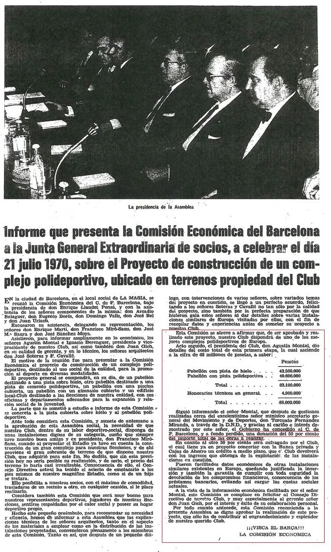 1970 - El gobierno otorga al Fútbol Club Barcelona una subvención a fondo perdido de unos 45 millones de pesetas para su complejo polideportivo.