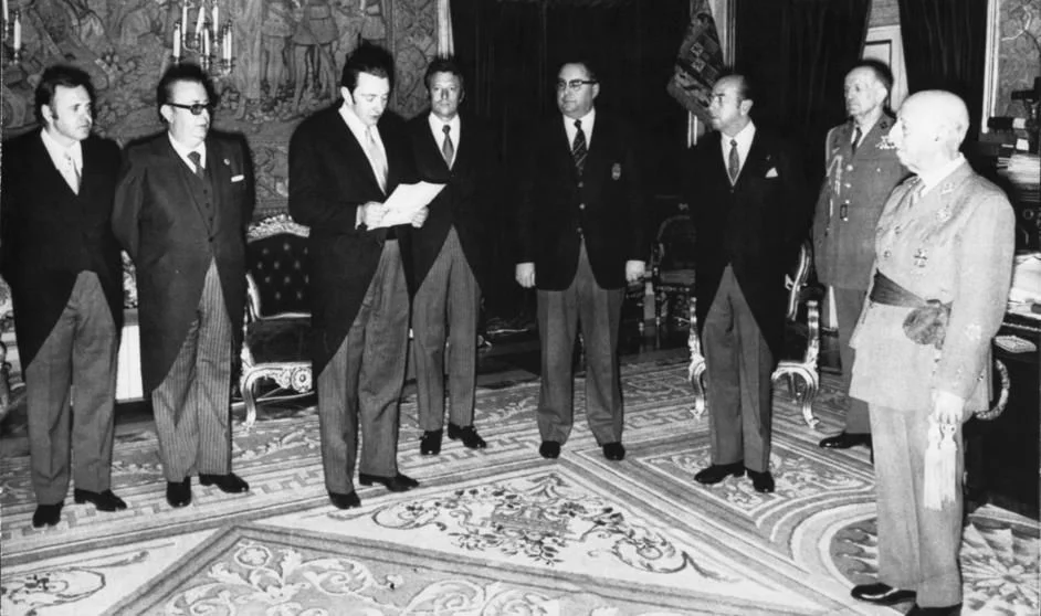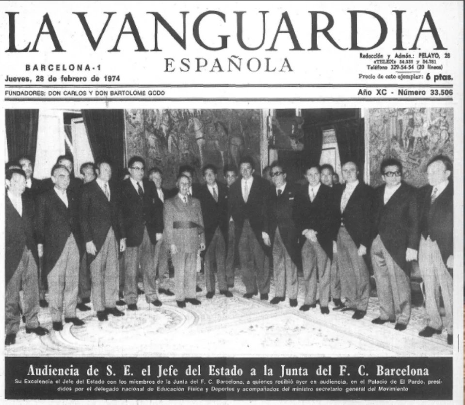 1975 – Muere Franco. Durante la dictadura, el FCB ganó 20 títulos nacionales (nadie ganó más Copas del Generalismó que el FCB) obtuvo 3 recalificaciones, condecoró al dictador en varias ocasiones, obtuvo una subvención a fond perdido y recibió la máxima distinción del régimen...