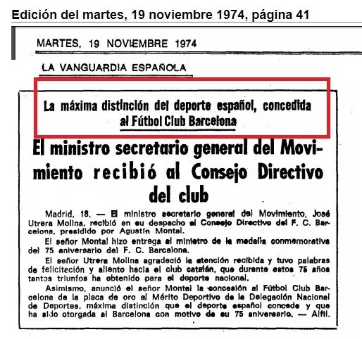 1974 - El gobierno de Franco concede al Barça la máxima distinción del deporte español.