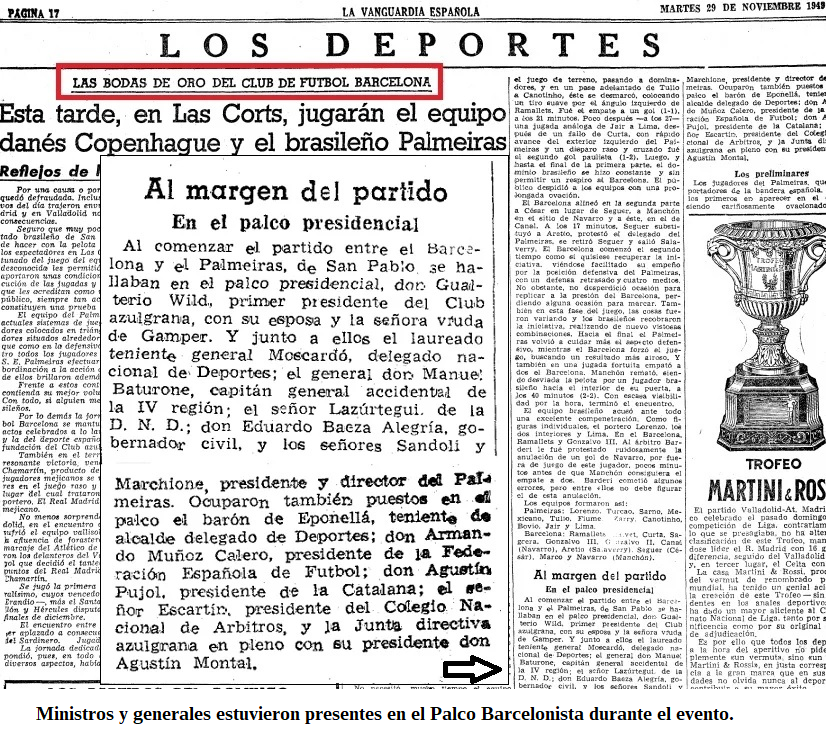 1949 - El FCB cumple 50 años. La FEF aplaza la Liga a favor de las Bodas de Oro y declarara libre el 27 de noviembre para que el Barça celebre su cumpleaños. Franco agradeció la adhesión del club azulgrana y hizo votos por la continuación de sus victorias.