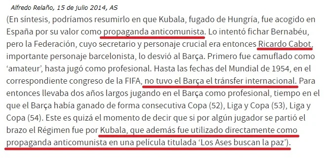 1950 –Kubala, entonces unos de los mejores jugadores de Europa, es fichado por el FCB. Diferentes historiadores y periodistas explican cómo el Régimen Franquista y la FEF ayudó en el fichaje.
