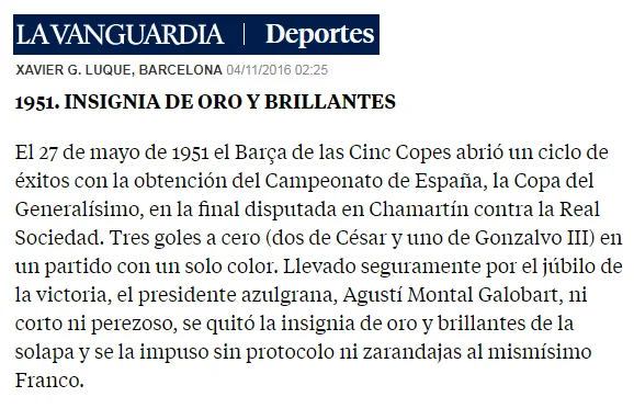 1951 – Agustí Montal Galobart, entonces presidente del Barça, se quitó la insignia de oro que tenía colocada y se la impuso a Franco. Sucedió minutos después de que el Barça levantara la Copa del Generalísimo. (3-0 vs Real Sociedad).