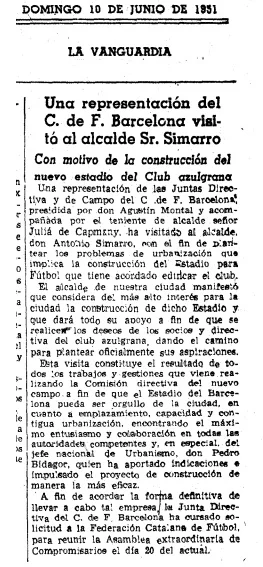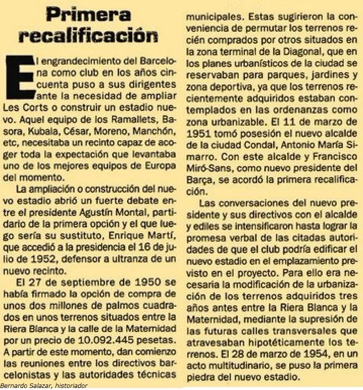1951 - El efecto Kubala, hizo necesario construir un nuevo estadio. Es la primera recalificación otorgada al Barça. Acordaron cambiar unos terrenos entre la Riera Blanca y la calle de la Maternidad por otros situados en la zona terminal de la Diagonal.