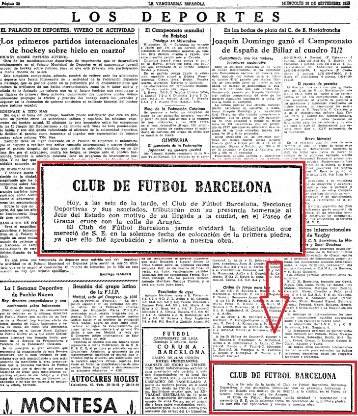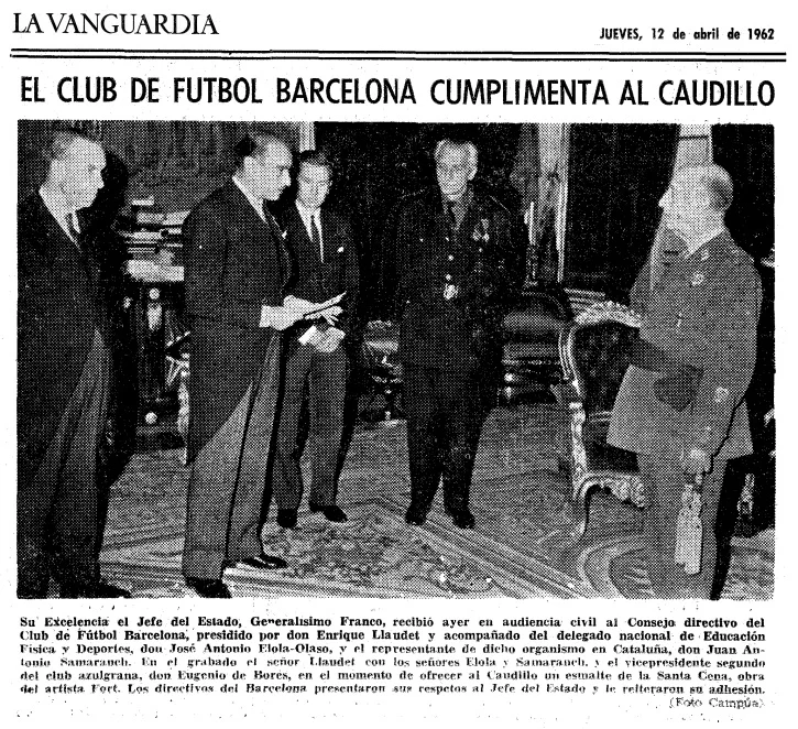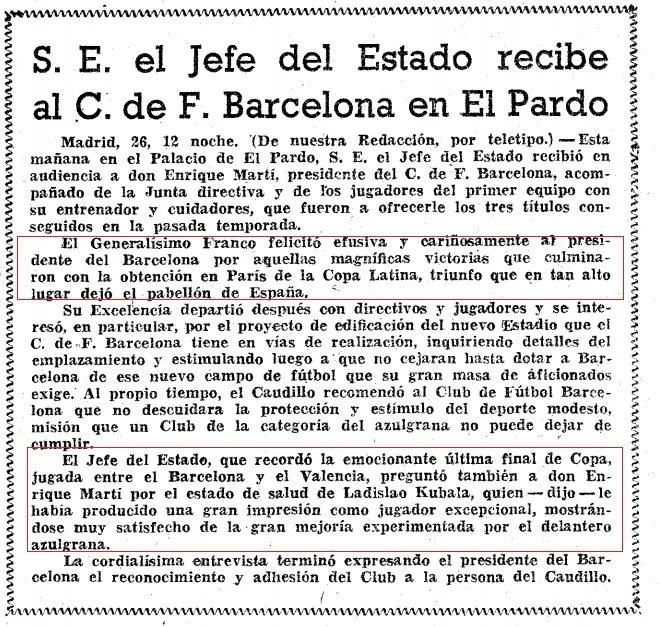 1953 - El club azulgrana solía emitir comunicados a través de La Vanguardia, para que sus socios y peñas vayan a recibir y animar a Franco durante sus visitas a Barcelona.