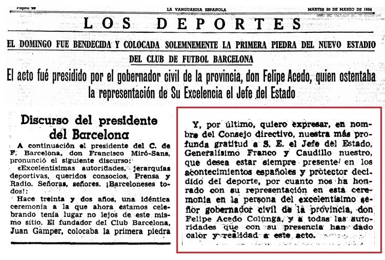 1954 – Multitudinario acto de colocación de la primera piedra del Camp Nou. El entonces presidente del Barça agradeció a Franco públicamente.