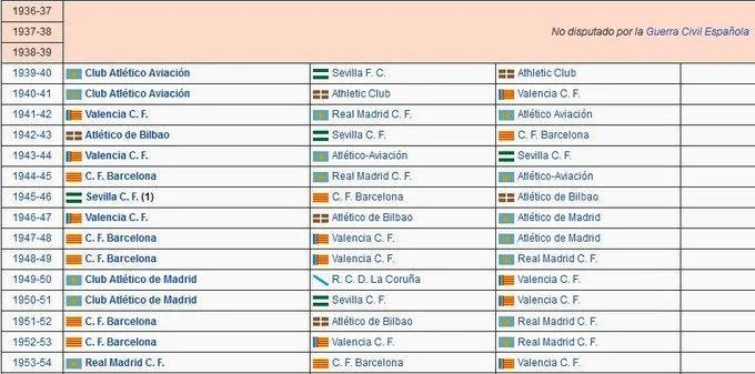 Barça 5 Ligas, Valencia 3, Atlético de Aviación 2, Ath.Bilbao, 1, Sevilla 1, Real Madrid 1.