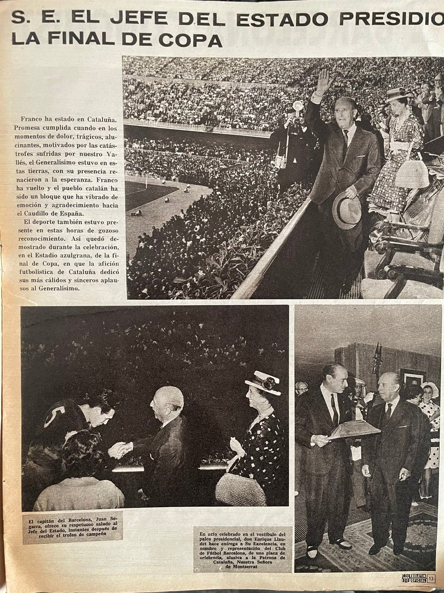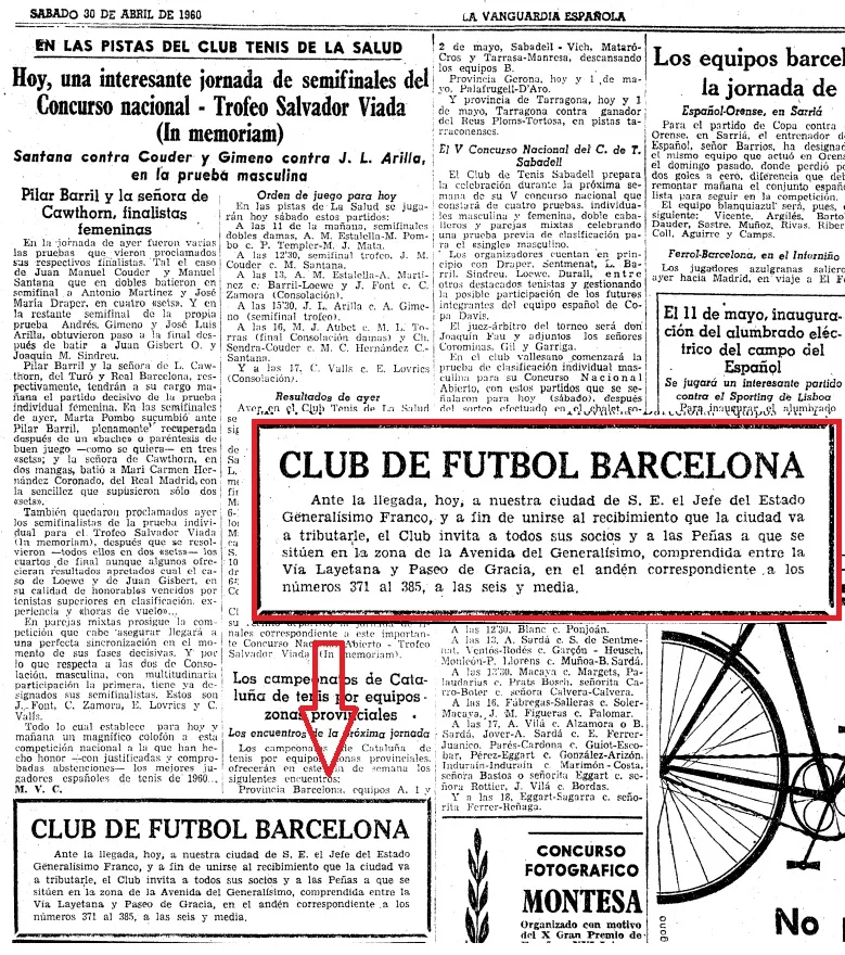 1960 - Nuevo ejemplo de comunicado por parte del Fútbol Club Barcelona a través de La Vanguardia, para que sus socios y peñas vayan a recibir a Franco en su visita a la ciudad de Barcelona. Lo que no hacía por ejemplo, el RCD Español.