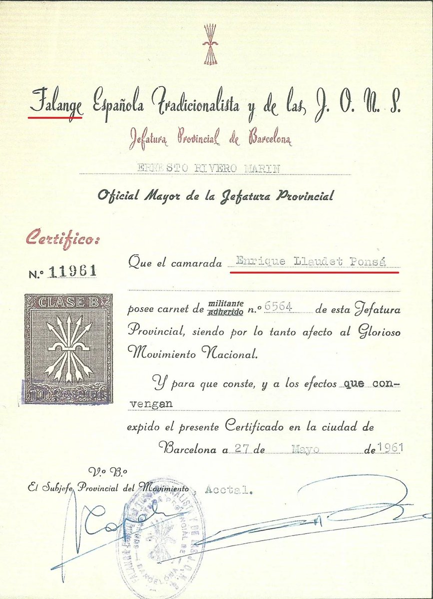 1961 - Enrique LLaudet es elegido presidente del Fútbol Club Barcelona. El siguiente archivo de la Federación de Fútbol Catalana demuestra cómo el nuevo mandatario azulgrana pertenecía a la Falange.
