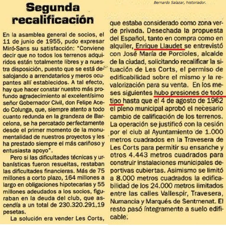 1962 - El Barcelona estaba ahogado por una deuda de más de 250 millones. El viejo Las Corts seguía en pie y su venta era la solución. Llegó la segunda recalificación al Barcelona.