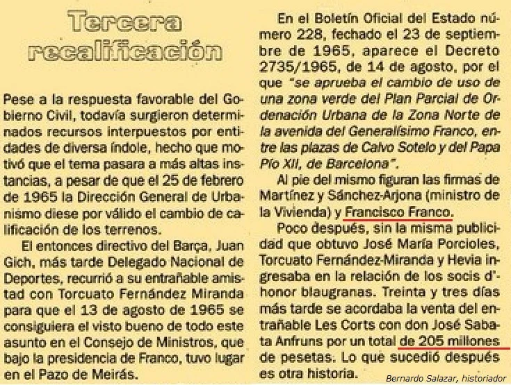 1965 - Tercera recalcification concedida al Barça. Joan Gich, consiguió la luz verde del Consejo de Ministros gracias a su amistad con Torcuato Fernández-Miranda.