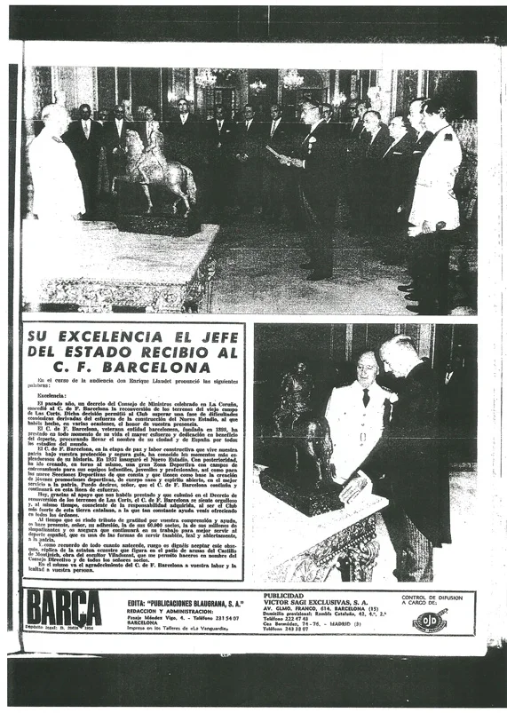 El presidente del Barça, Enrique Llaudet, agradece a Franco públicamente y en nombre del club. Además le regala una placa de orfebrería.