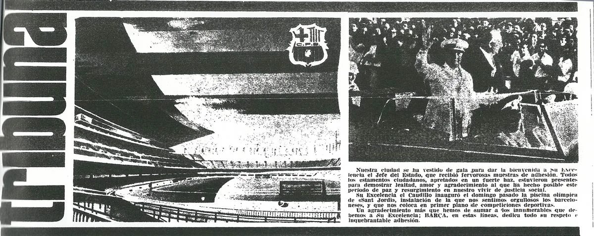 1966 - La revista oficial del Fútbol Club Barcelona agradece la visita y inauguración de la piscina "Sant Jordi" por Franco.
