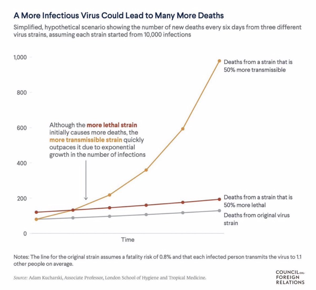 A 50% more transmissible variant will cause significantly more deaths than a 50% more severe strain because it will scale on an exponential growth curve instead of a linear curve.