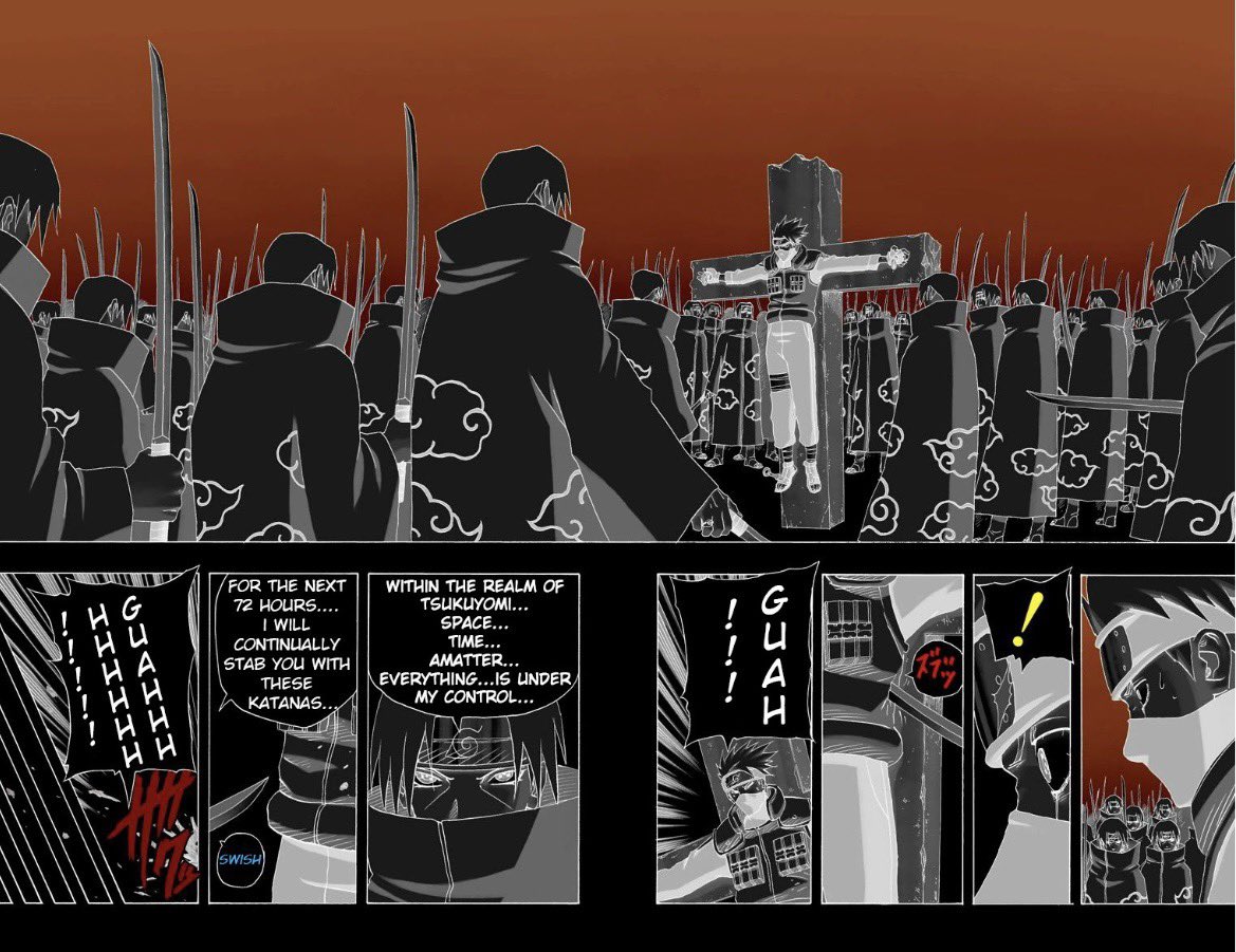 La planche de taré. Itachi a envoyé Kakashi dans un genjutsu où il se fait planter des katanas japonais pendant 72h. Il est tombé dans le coma pendant 1 semaine et a obtenu un arrêt de travail signée par le Hokage en personne car il était en incapacité totale de travail mdrrr