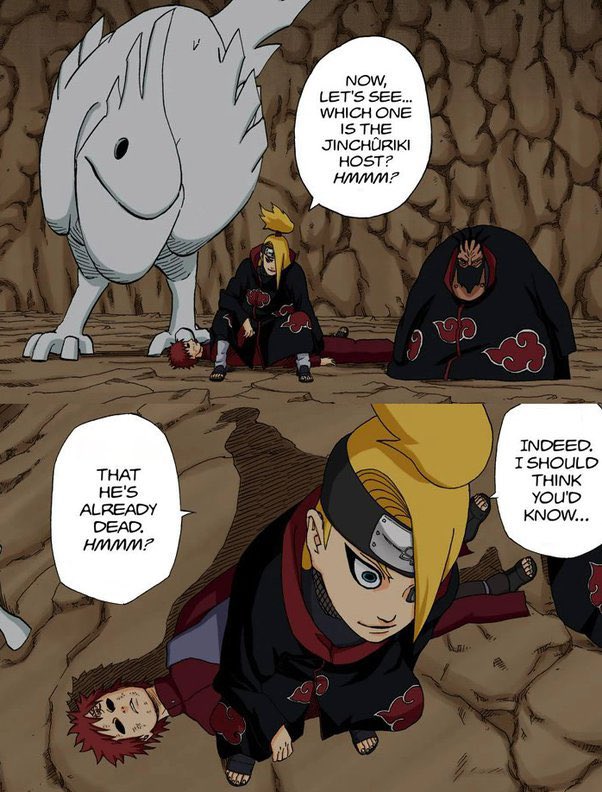 Faut que je rajoute ça, le summum de l’irrespect. Deidara, un bombardier a zigouiller à coup de pétards et de grenades un Jinchuriki et tellement il le respecte pas, il s’est assis sur sur lui comme si c’était un fauteuil pliant Quechua pour se dégourdir les jambes mdrrr.