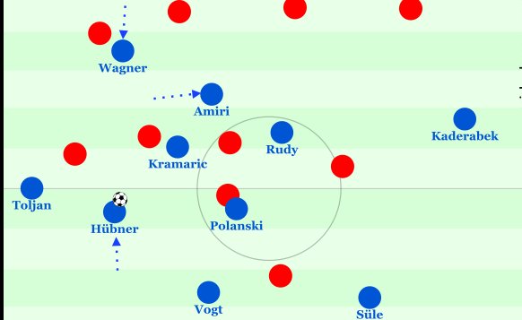 Here, his three defenders would play out from the back, usually the left or right CB would carry the ball forward, while in this case, Polanski would most likely take over/ cover for whichever wing back pushed up while the central defender carried the ball up the pitch. The two