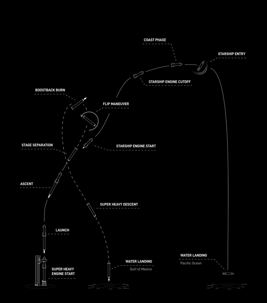 При идеальном сценарии Starship Super Heavy успешно взлетит, на высоте 64 км корабль отделится от ускорителя (и сам сядет в океане в 30 км от площадки), сам Старшип на высоте 121 км выключит свои двигатели, сделает почти полный виток и плюхнется животом о воду в 100км от Гавайи