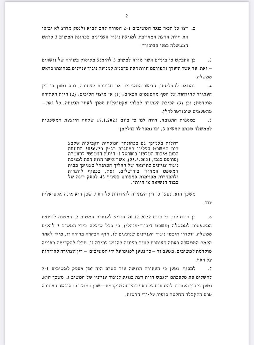 בתשובה לעתירה, הודיעה היועמ"ש שהסדר ניגוד העניינים שערך היועמ"ש הקודם מנדלבליט – בעינו עומד. אבל, היא הוסיפה אמירה בנוגע ל-"רפורמה המשפטית". >>