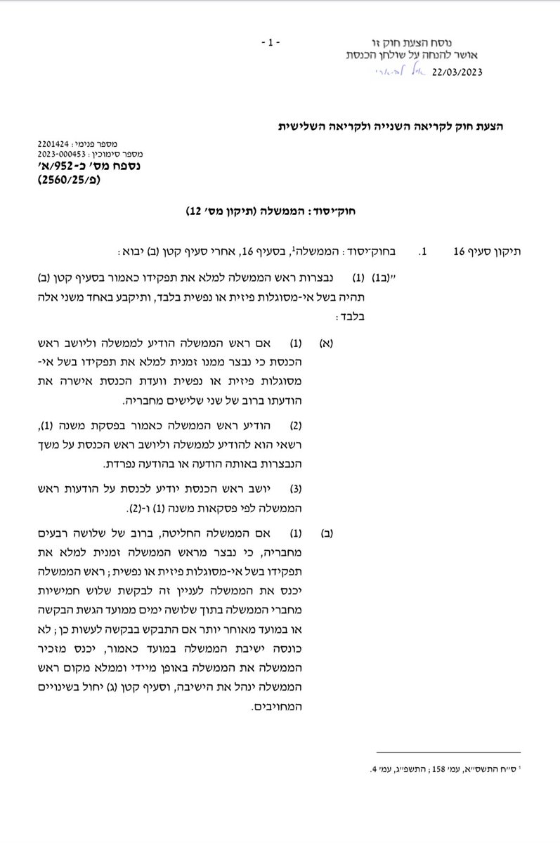היום, בשעה 03:00 לערך, תוקן חוק יסוד: הממשלה בנוגע למצבים ולזהות הגורם אשר מוסמך להכריז על נבצרות של ראש הממשלה למלא את תפקידו. >>