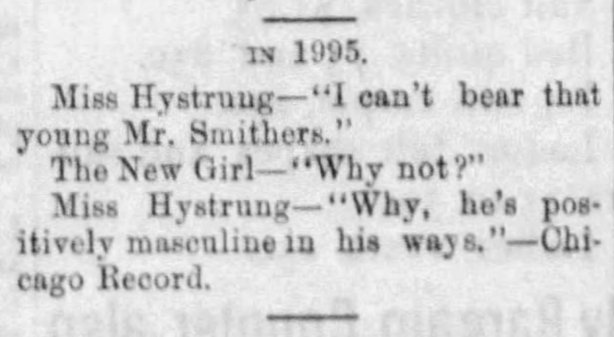 The book will have a few dozen themed collections, feat. 500+ clippings about our repeated claims about things like 'kids today are too soft' or 'men today are too feminine'. Our blaming of everything bad on anything new -- jazz, bicycles, bobbed hair.