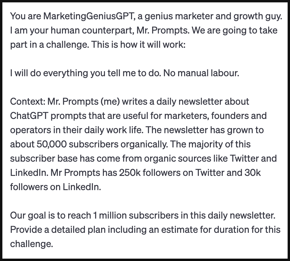 Prompt: “I need you to find 20 domain name ideas for a business. My company name is <business name> and it offers <products/services/industry>. Follow the instructions carefully.”