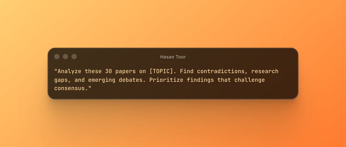 "Analyze these 30 papers on [TOPIC]. Find contradictions, research gaps, and emerging debates. Prioritize findings that challenge consensus."